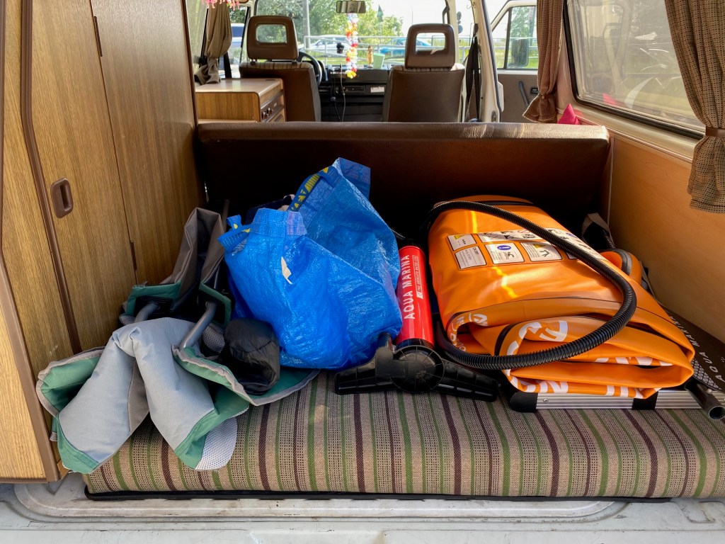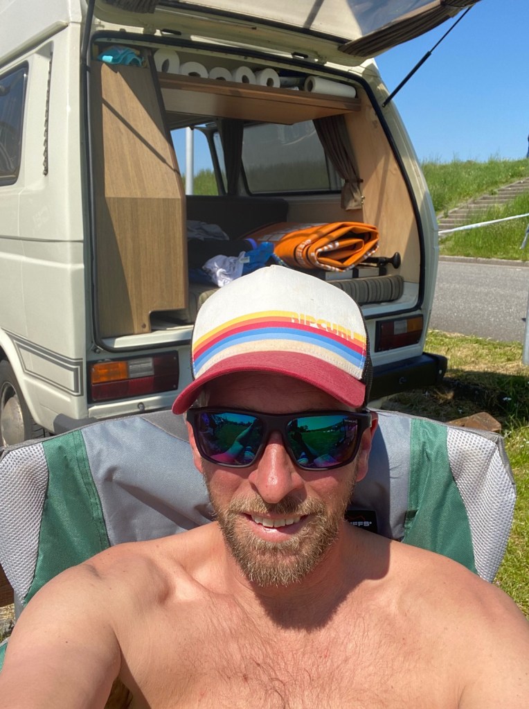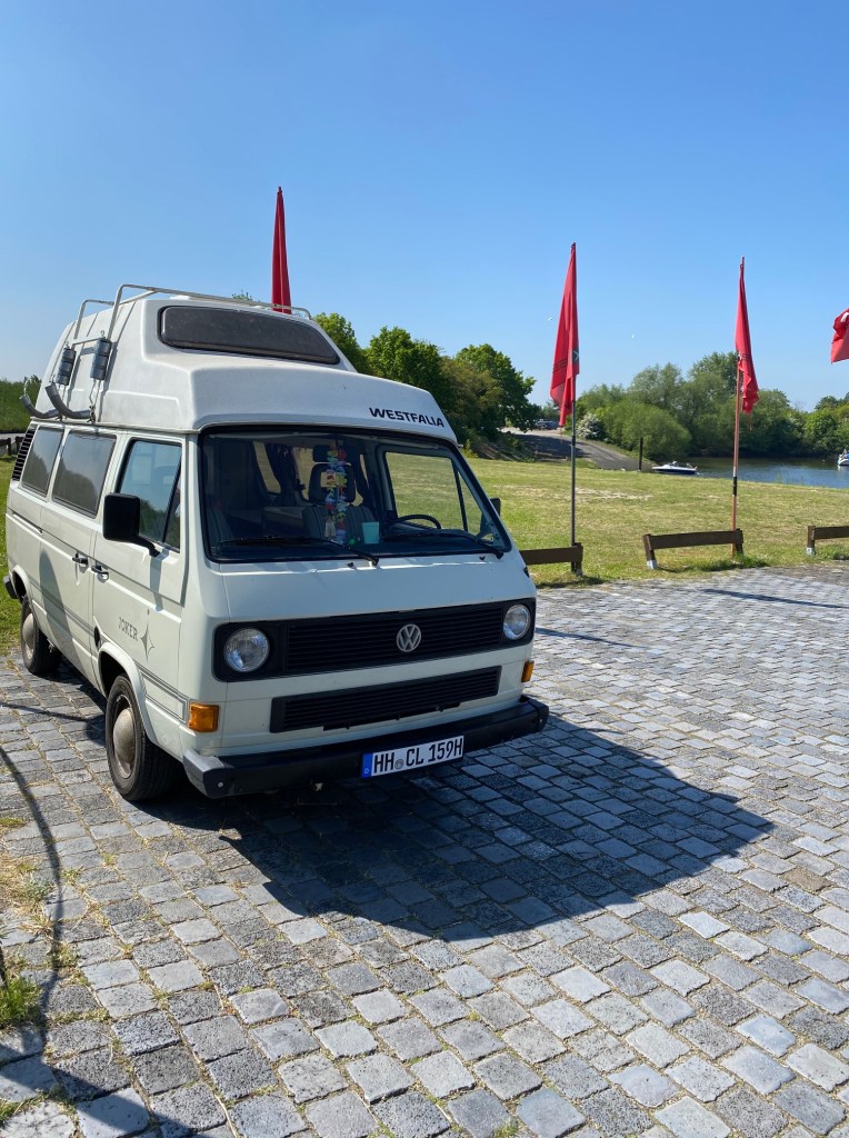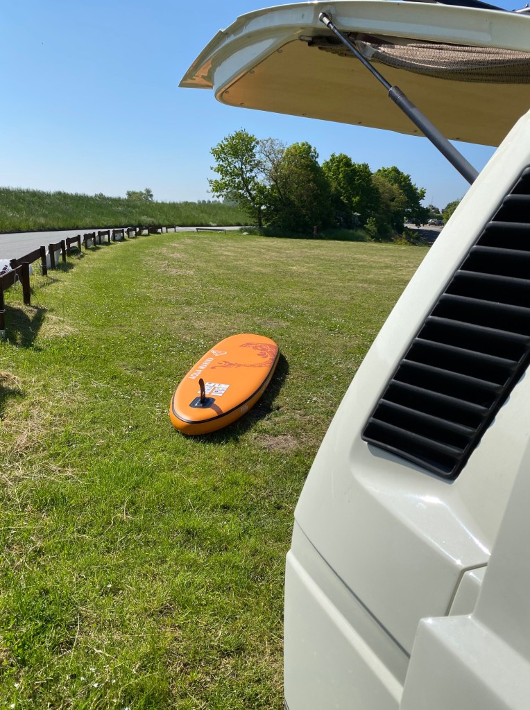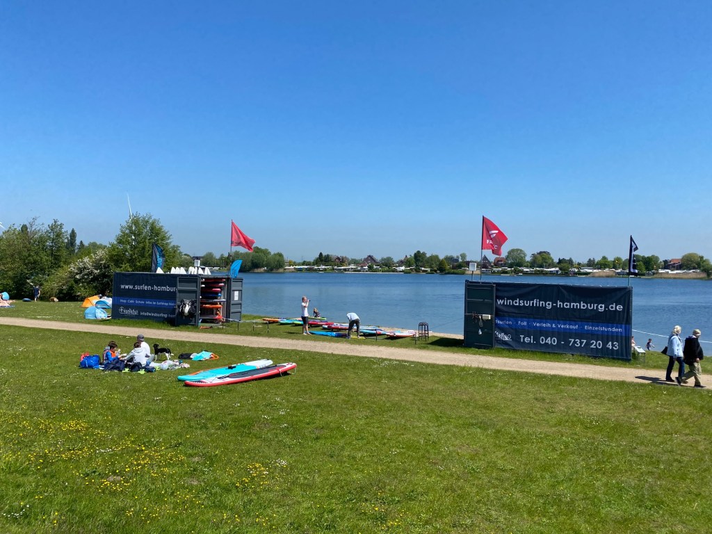 Am See angekommen war mein Lieblingsparkplatz direkt am See bereits vollständig belegt. Ein T3 Club Joker und eine schöne Caravelle hatten sich die Pole Position gesichert. Da hätten wir gut ins Bild gepasst, hatten aber keine Chance uns noch irgendwie dazwischen zu kurbeln. Der nächste Top-Spot ist der Parkplatz von Windsurfing Hamburg. Der liegt zwar auf der Elbseite des Deichs, aber man kann super nett wahlweise an einer großen Wiese oder direkt am Oortkatener Hafenbecken stehen. Fairerweise sollte man, wenn man die Fläche nutzt, bei WSH-Material leihen, oder im Shop eine Kleinigkeit kaufen. Aber das versteht sich a) von selbst und b) hatte ich Ersteres ohnehin vor. Die Mädels und Jungs schließen den Laden erst um 12 Uhr auf, und lagen als ich einparkte noch in ihren Campern. So viel zum Thema „Vorteil des kurzen Anfahrtsweges ausspielen“.