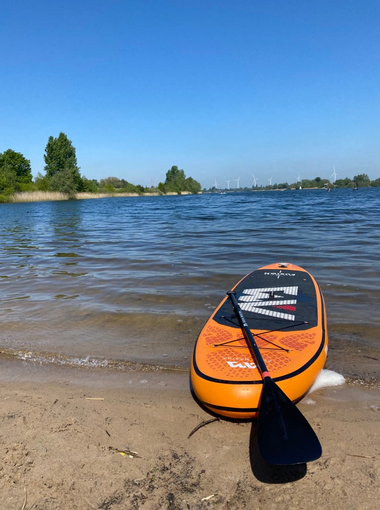 Um den Kreislauf auf Touren zu bringen, habe ich auf der Wiese mein SUP aufgepumpt, bin über den Deich zum Surfstrand gelaufen und habe eine Aufwärmrunde gedreht. Zuerst gegen den Wind hoch zur Nordspitze des Sees und dann ganz runter bis zum Badestrand am Südufer. Am Strand ist jetzt übrigens auch der Imbiss wieder geöffnet. Über Pfingsten waren die Schotten da noch dicht. Nach kurzer Verschnaufpause bin ich wieder zum Ausgangspunkt zurück gepaddelt. 75 Minuten dauerte die Tour insgesamt. Aufgewärmt für Teil 2 meines maritimen Sommerzweikampfs war ich alle mal. Ich ließ die Luft aus dem Board, zog mir einen Neo an und stellte zurück am Wasser fest, dass ich verkehrt herum in die neue Chest-Zip-Pelle geschlüpft war. Ganz offensichtlich war der eine Kaffee am Morgen nicht genug gewesen.