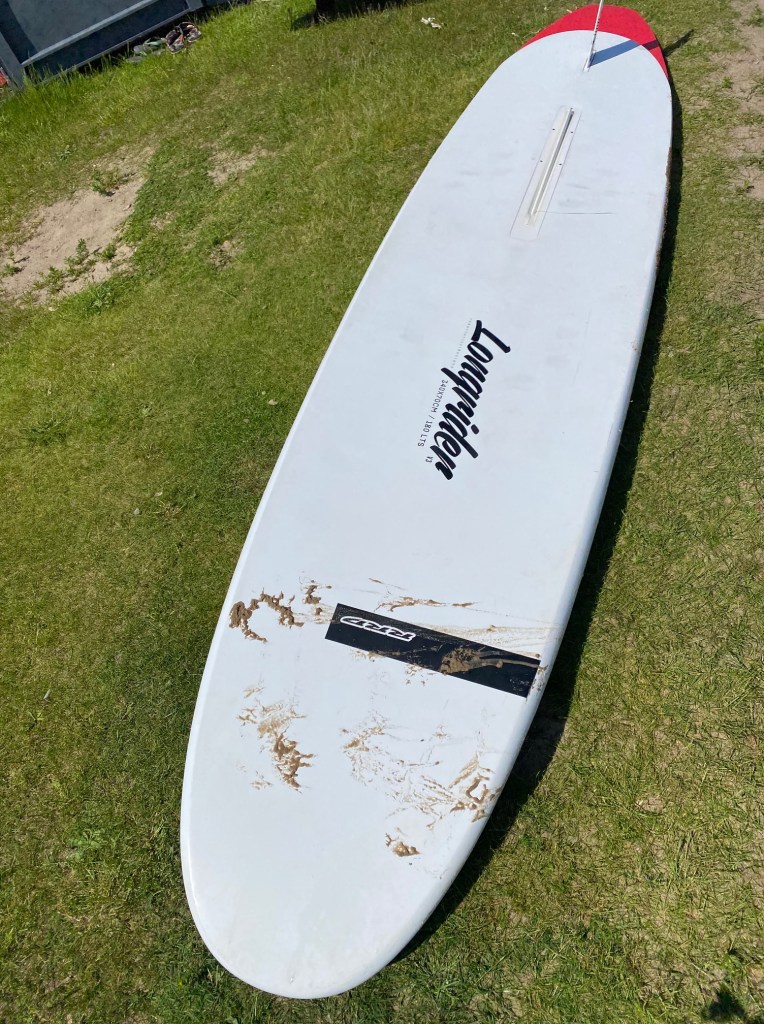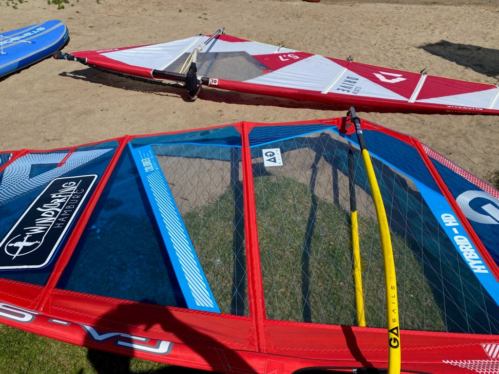 In den Materialcontainern von Windsurfing Hamburg findet sich eine ausreichende Auswahl an Boards und Segeln für Anfänger und ambitionierte, fortgeschrittene Surfer. Als ambitionierter Anfänger wählte ich ein 180 Liter Longboard und ein 5.7 Segel von Duotone. Wie (fast) immer kam der Wind ablandig, heute allerdings nur mit sanften 7-8 Knoten. Nichts desto trotz sind mir größere Segel im Handling zu anstrengend – zumindest nach nur einem Kaffee.
